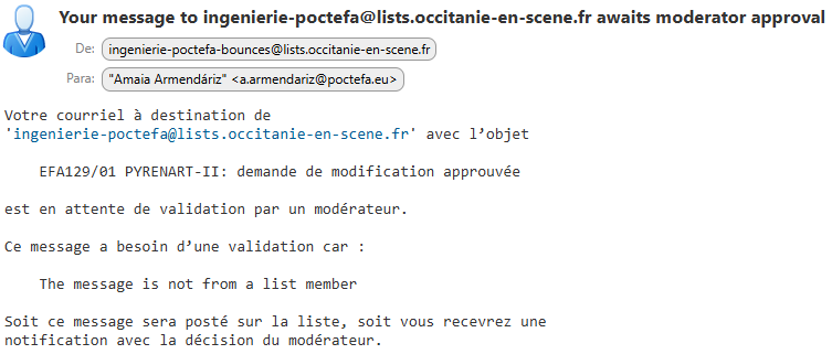 il n’y a aucune modification à apporter l’adresse ingenierie-poctefa ingenierie-poctefa@lists.occitanie-en-scene.fr est bien correcte mais c’est une liste de diffusion et les messages sont filtrés/modérés.