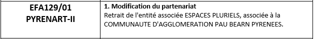 De: "Amaia Armendáriz" a.armendariz@poctefa.eu Para: "s courouble" s.courouble@occitanie-en-scene.fr, "a picgirard" a.picgirard@occitanie-en-scene.fr, "administration" administration@occitanie-en-scene.fr, "y godard" y.godard@occitanie-en-scene.fr, "direction" direction@occitanie-en-scene.fr, "ingenierie-poctefa" ingenierie-poctefa@lists.occitanie-en-scene.fr, "Juliette PUYJALINET" j.puyjalinet@occitanie-en-scene.fr CC: "l meissel" l.meissel@agglo-pau.fr Enviados: Miércoles, 18 de Junio 2025 8:12:50 Asunto: EFA129/01 PYRENART-II: demande de modification approuvée